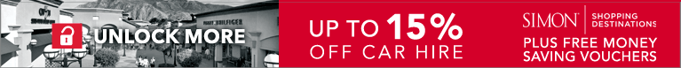 We have teamed up with Simon Shopping Destinations in North America to make your next road trip even more rewarding. Now you can save up to 15% on your car hire and receive some exciting shopping discounts too.